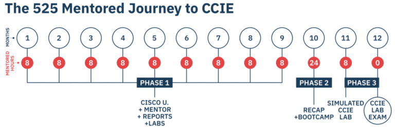 Project 525 is a structured 12-month mentoring program, developed in collaboration with Cisco, designed to prepare IT professionals for the CCIE exam. It provides a comprehensive and structured approach to learning, combining guided study, hands-on practice, and expert mentorship to ensure success.